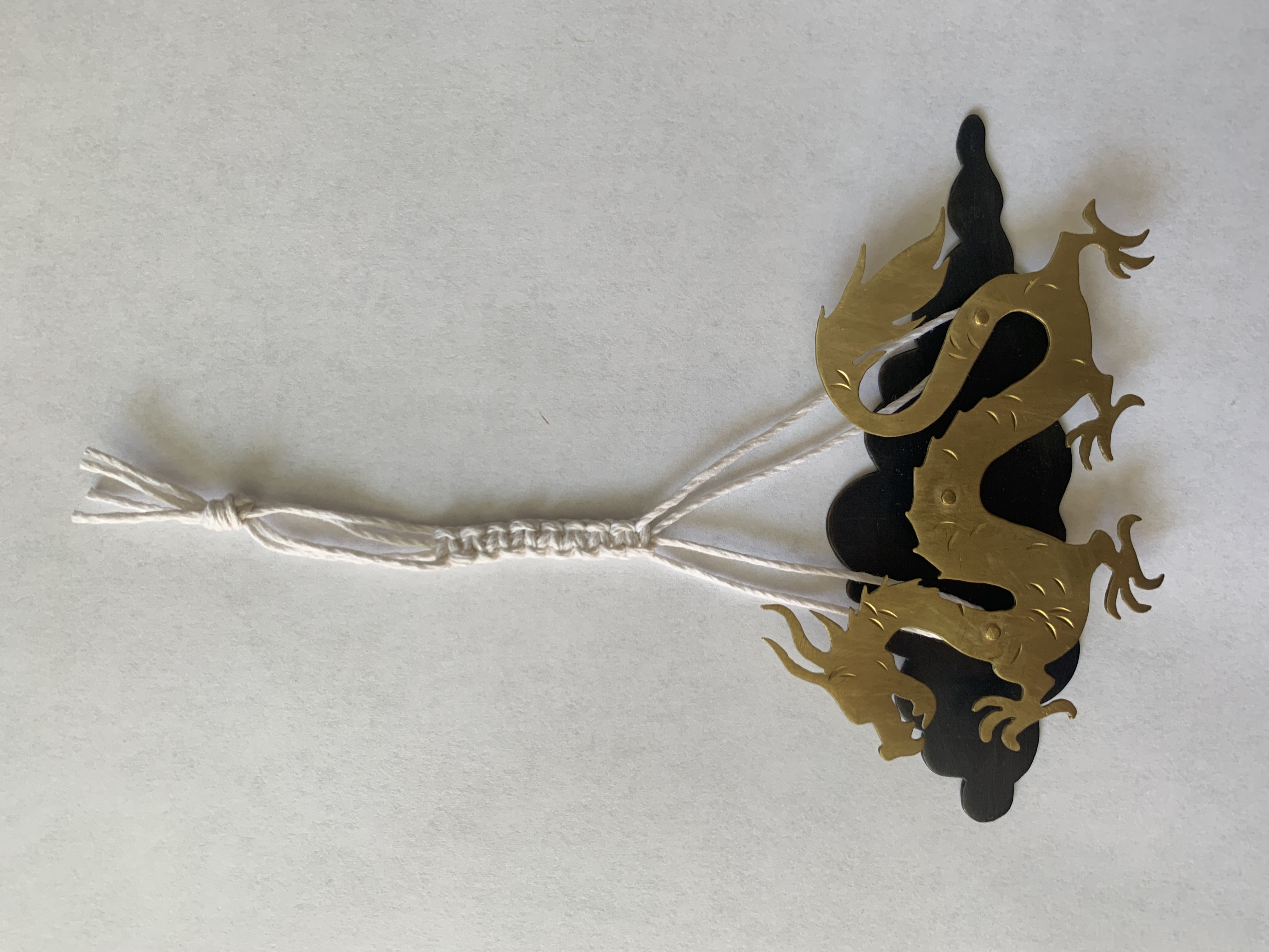 The year I was born, 2000, was the year of the Golden Dragon. So when I got an assignment to create an alternative cameo with brass or copper, I knew a golden dragon was perfect. The dragon is cut from brass and the cloud is copper dipped in a liver of sulfur patina. It is about 4.25in x 2.5in x 0.25in.