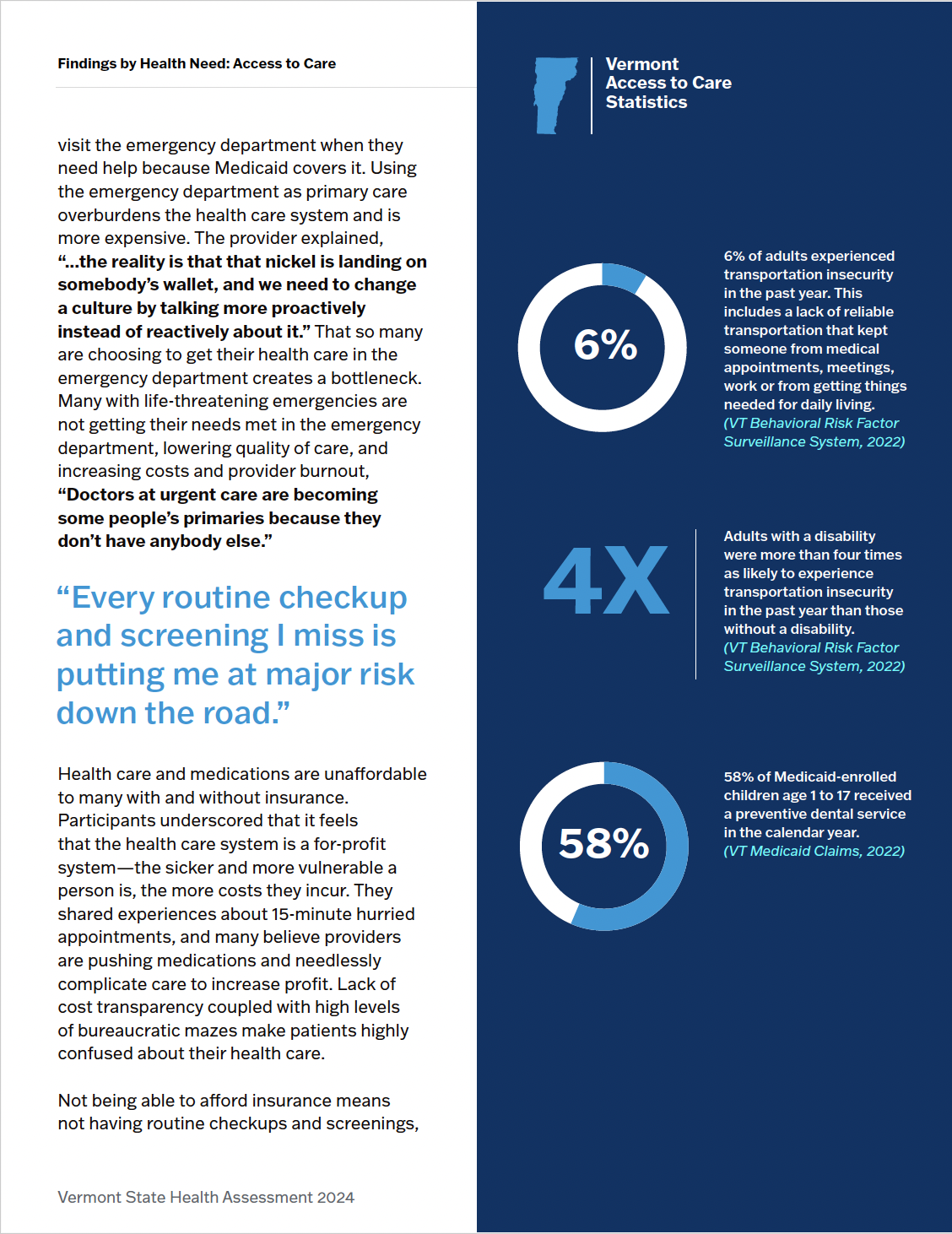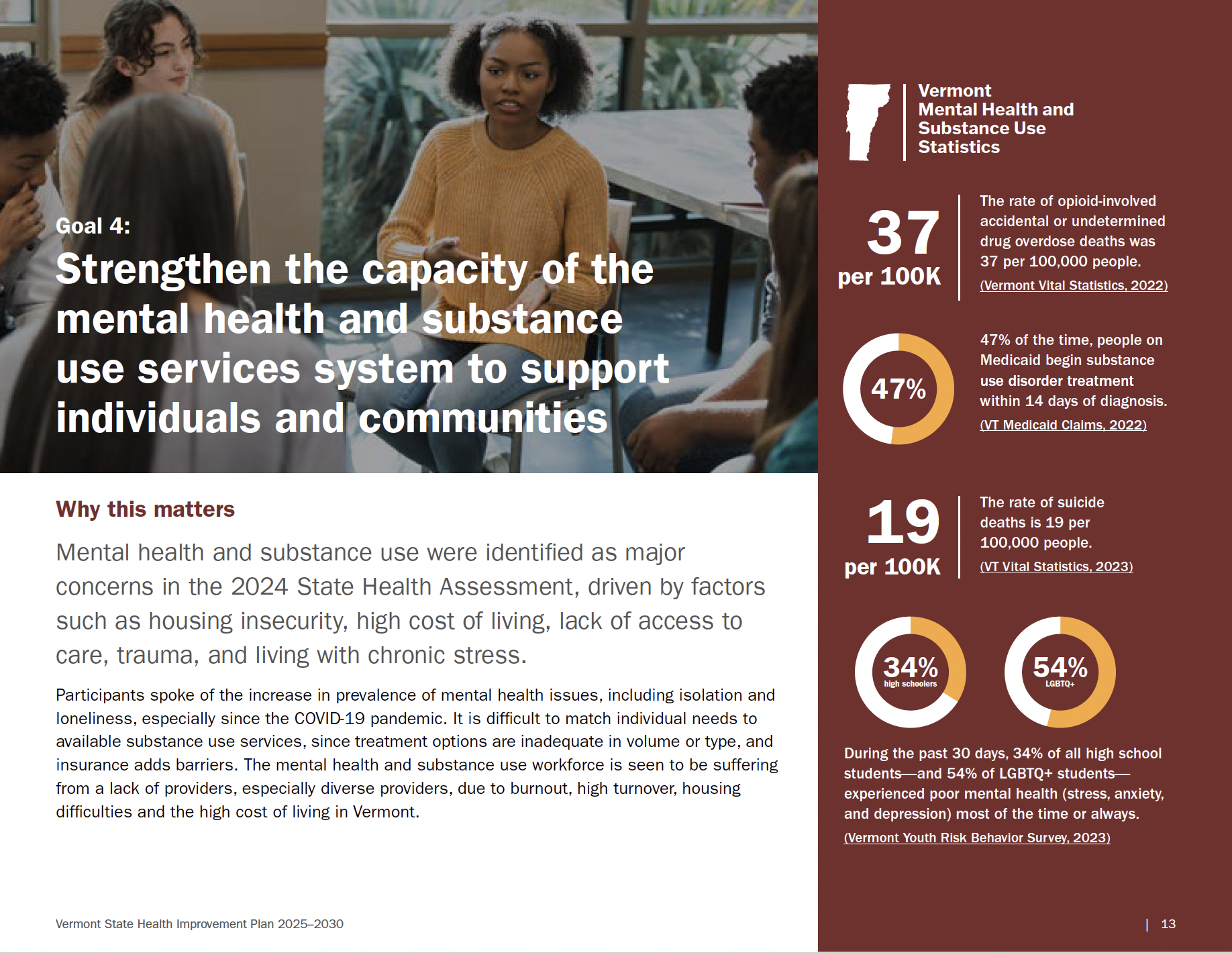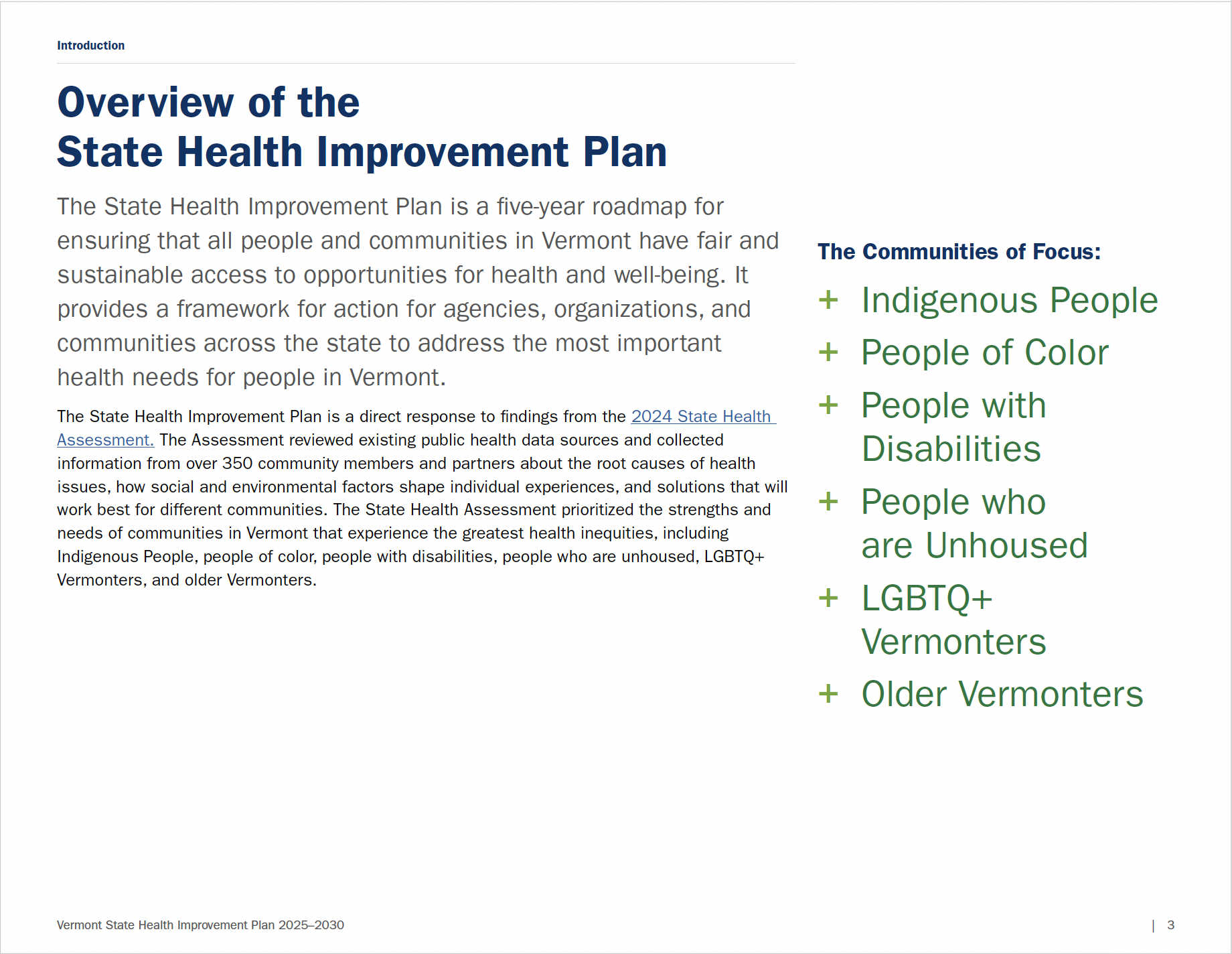 The Vermont State Health Assessment is conducted every five years. It is an overview of the health of people in Vermont at a point in time, and the data is used to understand health outcomes and differences across groups. Based on the results, the Health Improvement Plan is developed for the five years between assessments.