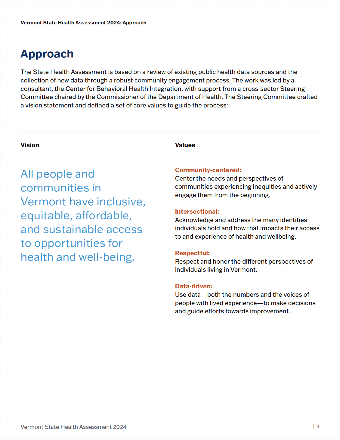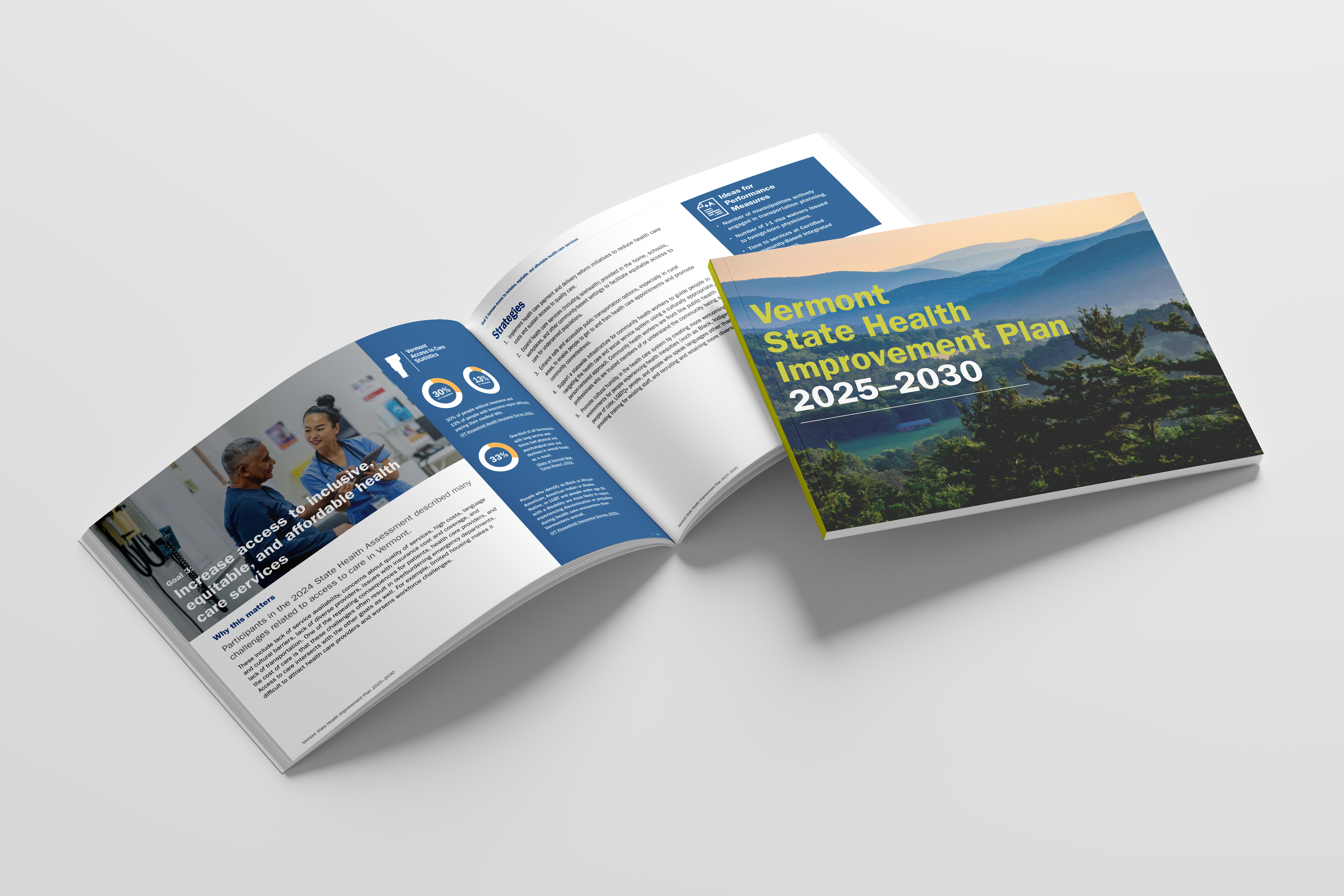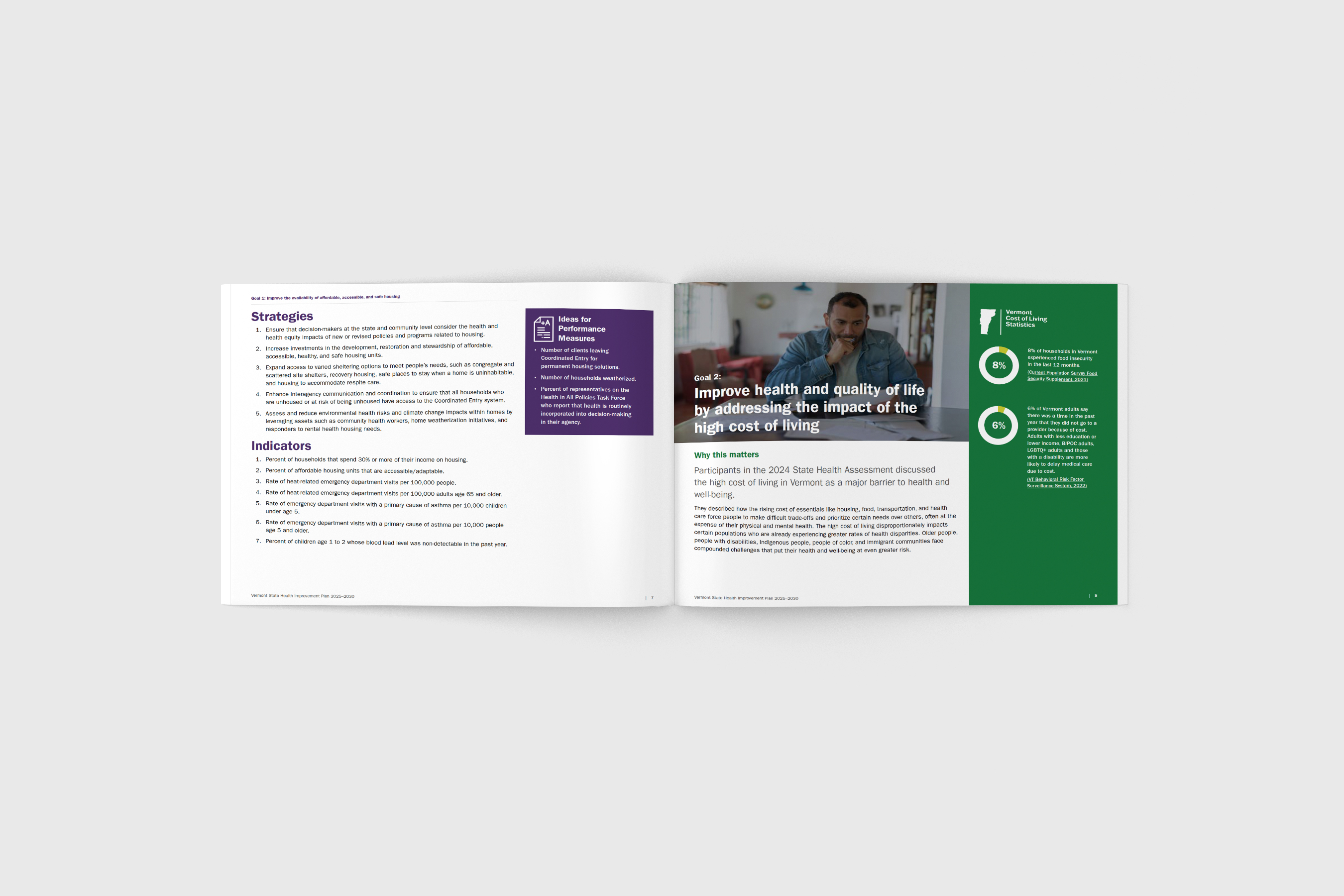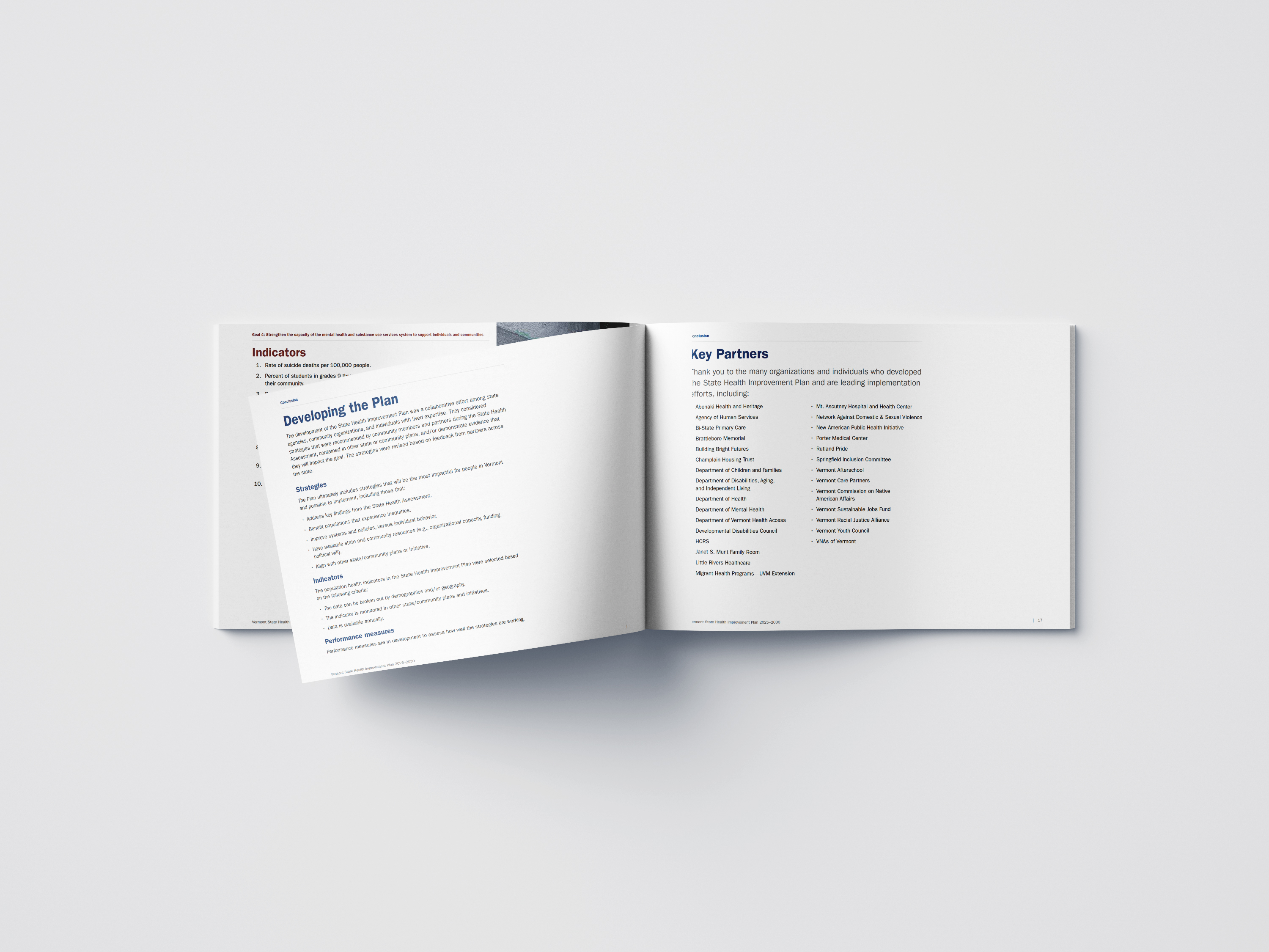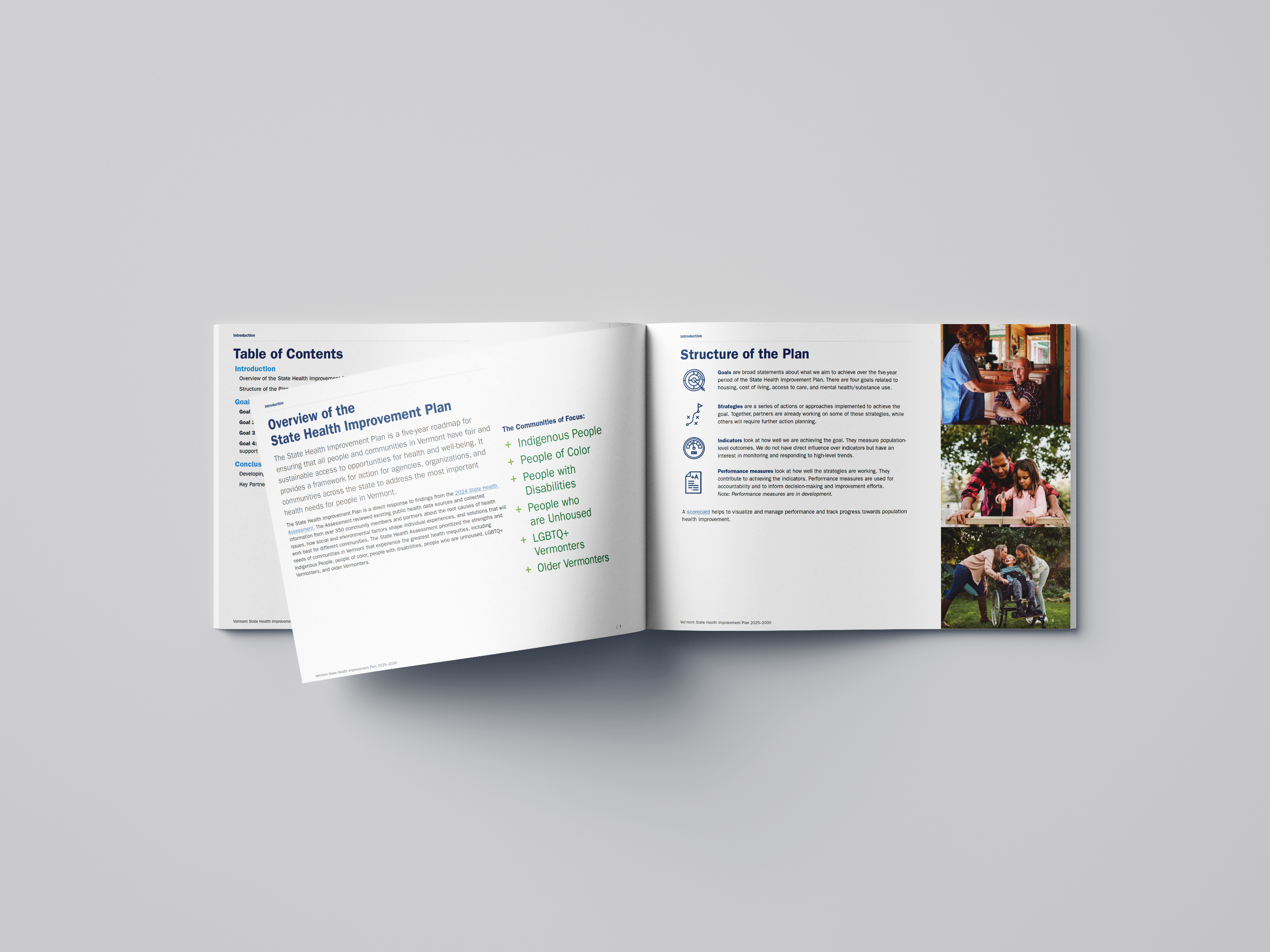 The Vermont Department of Health provided Pluck with the State Health Assessment, fully designed, and the copy for the State Health Improvement Plan. These documents would be companion pieces, despite being designed by separate people. My goal was to convey the information in a digestible way while also creating a layout that felt like an extension of the assessment.